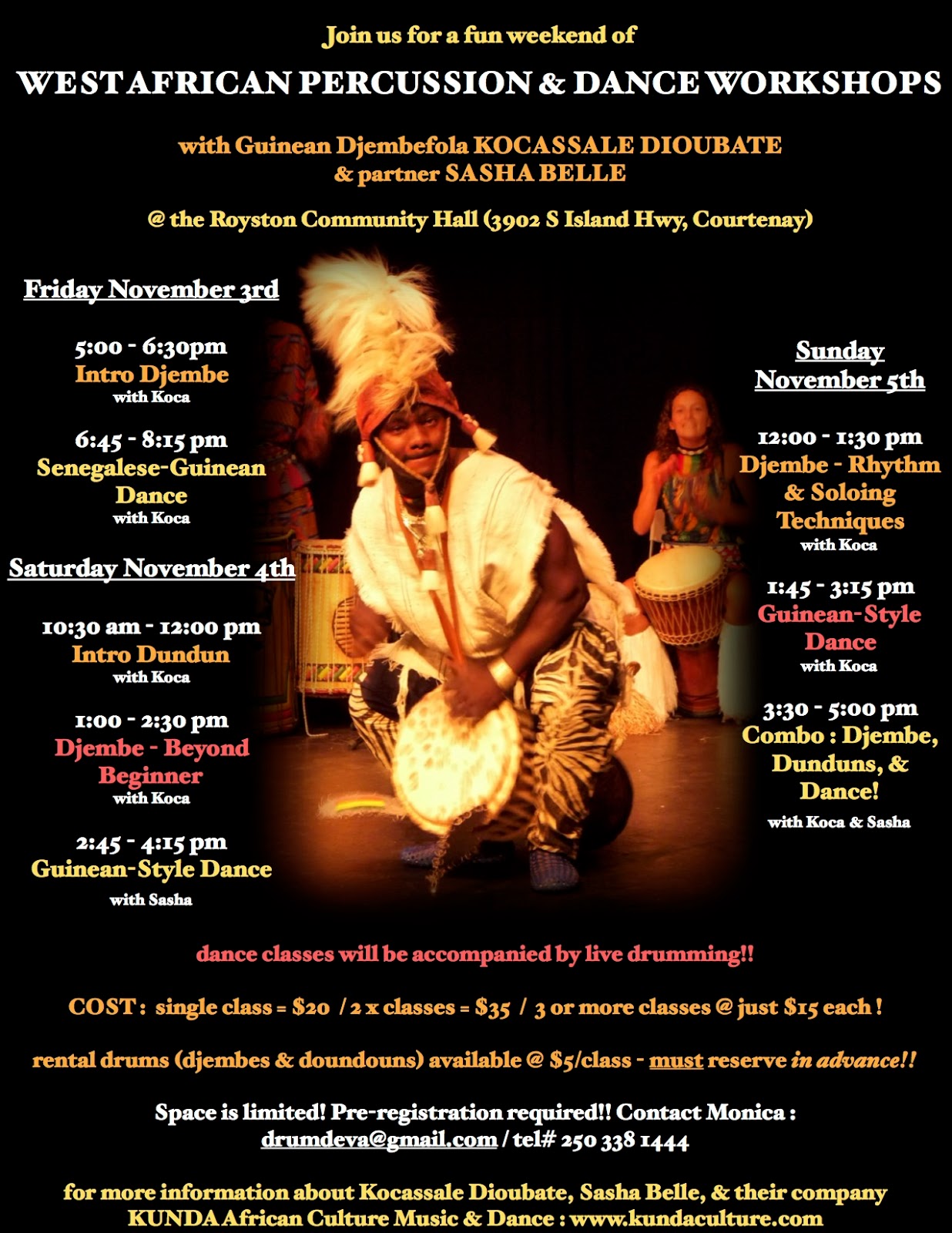 We currently have one balafon available (for rent but preferably for sale) so would welcome one new member to the team! (More welcome if you’re willing to purchase a balafon from Jordan in Victoria; all of our balafons are tuned the same). Again, our group will not be going back to the “basics” but you could definitely be brought up to speed by joining a practice group or having one private lesson with Monica J